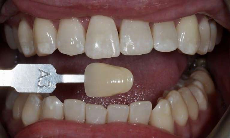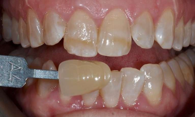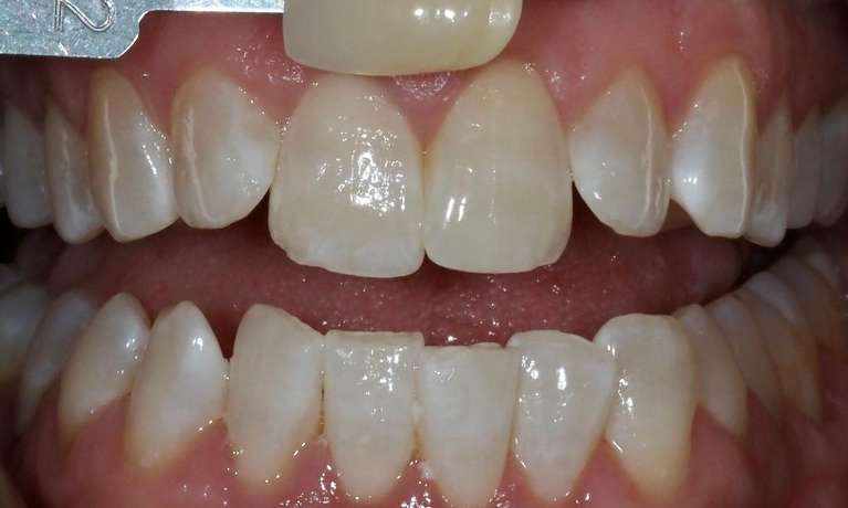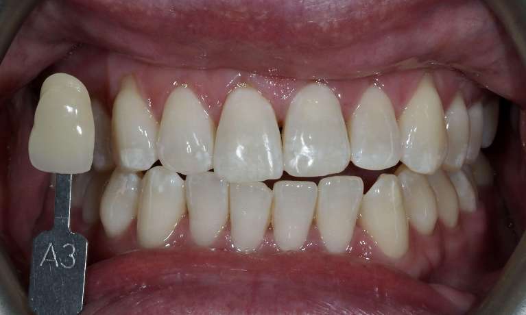 Our lovely patient wanted to do something about the brown markings on her teeth that were darkening as she headed into her late forties. Her background colour was A2. What worried her was the darker brown markings that were A4. She did not want to incur the biologic cost of loss of enamel that comes with ceramic veneers. These stubborn brown types of markings are challenging to improve. Dr Gourlay recommended that she use our night whitening gel which is a 16% carbamide peroxide. This gel was used in custom made trays with a gingival seal overnight for 2 weeks. ...