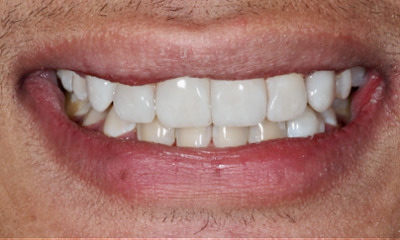 This patient presented with concerns about the damage his teeth had sustained from his bite and previous habits. His lower teeth had caused erosion and wear on the palatal surfaces and incisal edges of his upper front teeth. He was also concerned about the crowding of the lower front teeth. His primary goal was to create a more protected alignment and function of his teeth to support better oral health and longevity.
